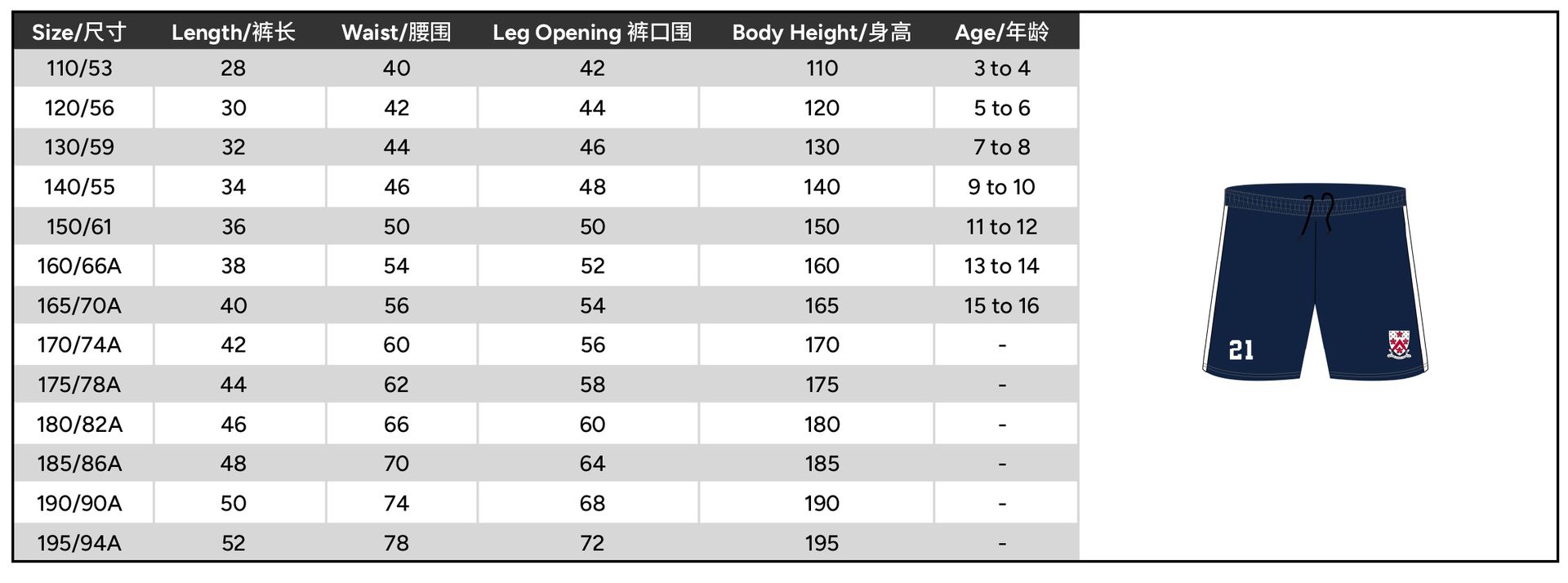 Size 110 or 120 or 130 or 140 or 150 or 160 or 165 or 170 or 175 or 180 or 185 or 190 or 195